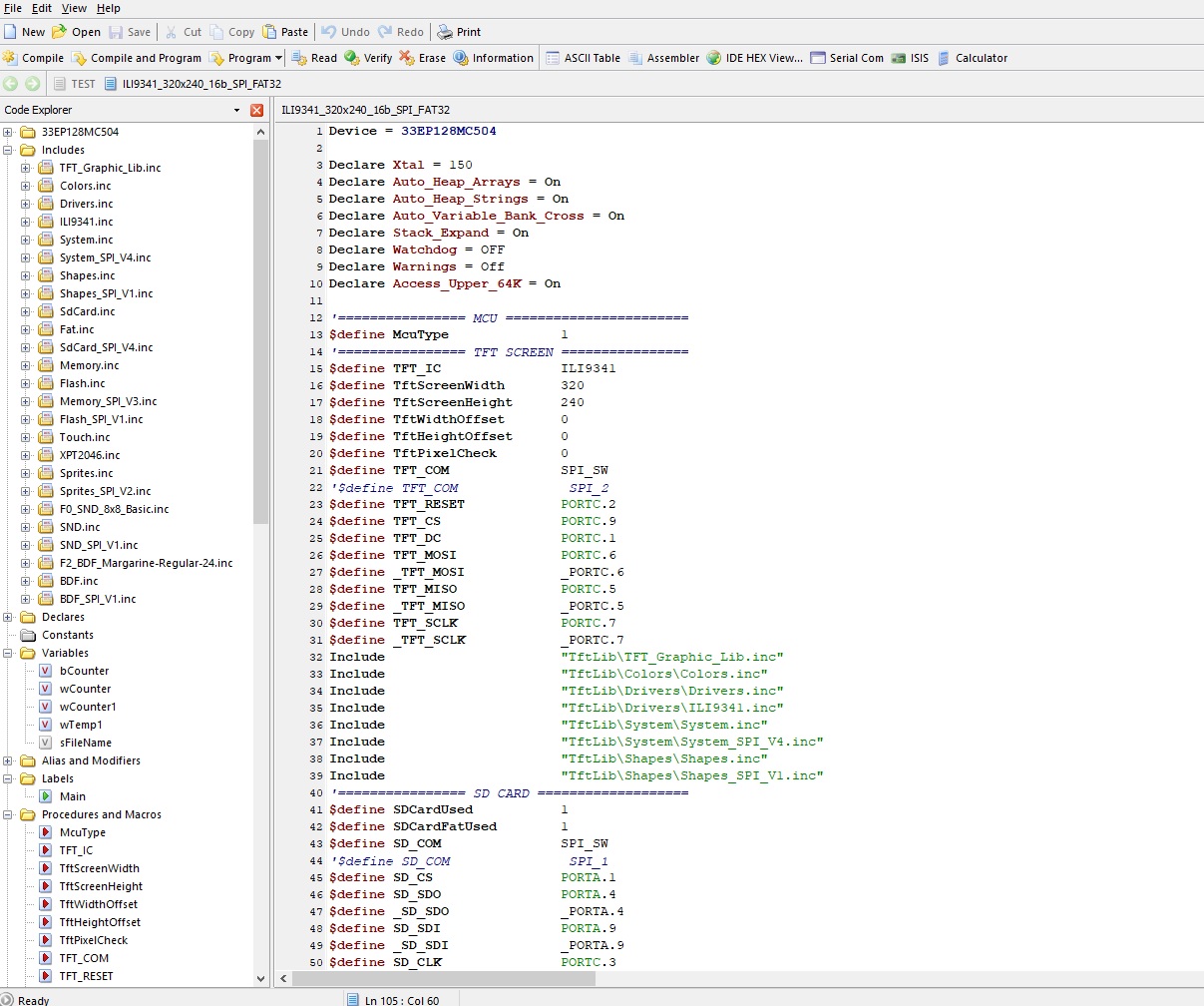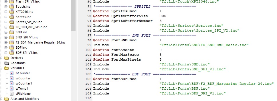 Directly after your Device and Declare sections, begin including library defines. Use TFT_Graphic_Lib.exe to generate the necessary ones. Include only all sections to your project even if a part of the library is not used. If a memory IC or SD Card shares an SPI bus with any other peripheral, remember to set their CS pins high, normally it is done in the library during boot time, but still good to be sure.