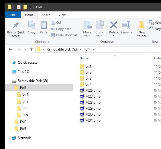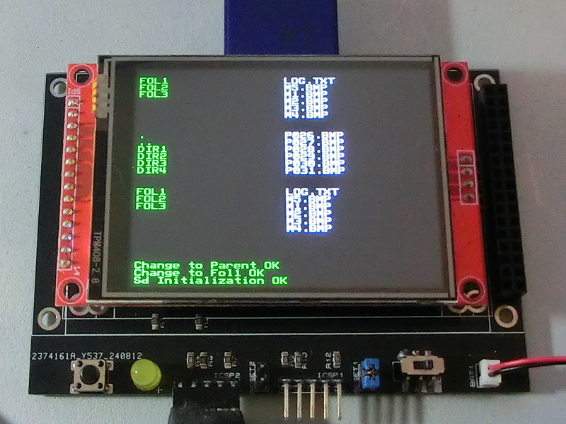 TftSetUp(0) 'Set screen TftResetScreen(BLACK) 'Reset screen TftSetSndFont(0,0) 'Set Font0 While File_Init() <> cErrOK : Wend 'Initialize SD Card TftPrintSndString("Sd Initialization OK",1,0,0,1,GREEN,BLACK,0) 'Confirm Initialize SD Card DisplayFolderFile(28) 'Call file/folder list Proc, set display row 28 If File_ChDir("Fol1") = 1 Then 'Change current folder to Fol1 TftPrintSndString("Change to Fol1 OK",1,0,1,1,GREEN,BLACK,0) 'Confirm change folder To Fol1 DisplayFolderFile(20) 'Call file/folder list Proc, Set display row 20 Else TftPrintSndString("Change to Fol1 Fail",1,0,1,1,GREEN,BLACK,0) 'Folder change fail EndIf If File_ChDirUp() = 1 Then 'Return to parent directory TftPrintSndString("Change to Parent OK",1,0,2,1,GREEN,BLACK,0) 'Confirm change to parent folder DisplayFolderFile(12) 'Call file/folder list Proc, Set display row 12 Else TftPrintSndString("Change to Parent Fail",1,0,2,1,GREEN,BLACK,0) 'Folder change to parent fail EndIf End Proc DisplayFolderFile(wY As Word) bCounter = wY File_ListReset() 'Reset file/folder counter Do Clear sString sString = File_ListDir() 'Loop through folder names If sString = 0 Then Break 'Break if end of list TftPrintSndString(sString,1,0,bCounter,1,GREEN,BLACK,0) 'Print folder name Dec bCounter 'Move to next print line Loop bCounter = wY 'Vertical print counter File_ListReset() 'Reset file/folder counter Do 'Loop through file names Clear sString sString = File_ListFile() If sString = 0 Then Break 'Break if end of list TftPrintSndString(sString,1,20,bCounter,1,WHITE,BLACK,0) 'Print folder name Dec bCounter 'Move to next print line Loop EndProc |