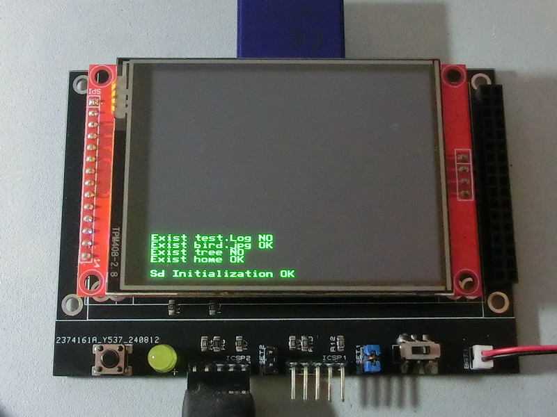 TftSetUp(0) 'Set screen TftResetScreen(BLACK) 'Reset screen TftSetSndFont(0,0) 'Set Font0 While File_Init() <> cErrOK : Wend 'Initialize SD Card TftPrintSndString("Sd Initialization OK",1,0,0,1,GREEN,BLACK,0) 'Confirm Initialize SD Card If File_Exists("bird.jpg") = 1 Then TftPrintSndString("Exist bird.jpg OK",1,0,4,1,GREEN,BLACK,0) 'bird.jpg exists (expected) Else TftPrintSndString("Exist bird.jpg NO",1,0,4,1,GREEN,BLACK,0) 'bird.jpg not exists EndIf If File_Exists("test.log") = 1 Then TftPrintSndString("Exist test.Log OK",1,0,5,1,GREEN,BLACK,0) 'test.Log exists Else TftPrintSndString("Exist test.Log NO",1,0,5,1,GREEN,BLACK,0) 'test.Log not exists (expected) EndIf If File_DirExists("home") = 1 Then TftPrintSndString("Exist home OK",1,0,2,1,GREEN,BLACK,0) 'home folder exists (expected) Else TftPrintSndString("Exist home NO",1,0,2,1,GREEN,BLACK,0) 'home folder not exists EndIf If File_DirExists("tree") = 1 Then TftPrintSndString("Exist tree OK",1,0,3,1,GREEN,BLACK,0) 'tree folder exists Else TftPrintSndString("Exist tree NO",1,0,3,1,GREEN,BLACK,0) 'tree folder not exists (expected) EndIf |