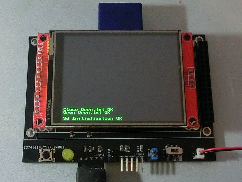 TftSetUp(0) 'Set screen TftResetScreen(BLACK) 'Reset screen TftSetSndFont(0,0) 'Set Font0 While File_Init() <> cErrOK : Wend 'Initialize SD Card TftPrintSndString("Sd Initialization OK",1,0,0,1,GREEN,BLACK,0) 'Confirm Initialize SD Card While File_Open("Open.txt") <> cErrOK : Wend 'Open file Open.txt to edit data TftPrintSndString("Open Open.txt OK",1,0,2,1,GREEN,BLACK,0) 'Confirm Open.txt is open bCounter = 0 'Print position counter Do TftPrintSndChar(File_ReadByte(),1,bCounter,3,1,GREEN,BLACK,0) 'Print data as text If File_EOF() = 1 Then Break 'Loop till end of file Inc bCounter Loop File_Close() 'close file TftPrintSndString("Close Open.txt OK",1,0,4,1,GREEN,BLACK,0) 'Confirm close file |