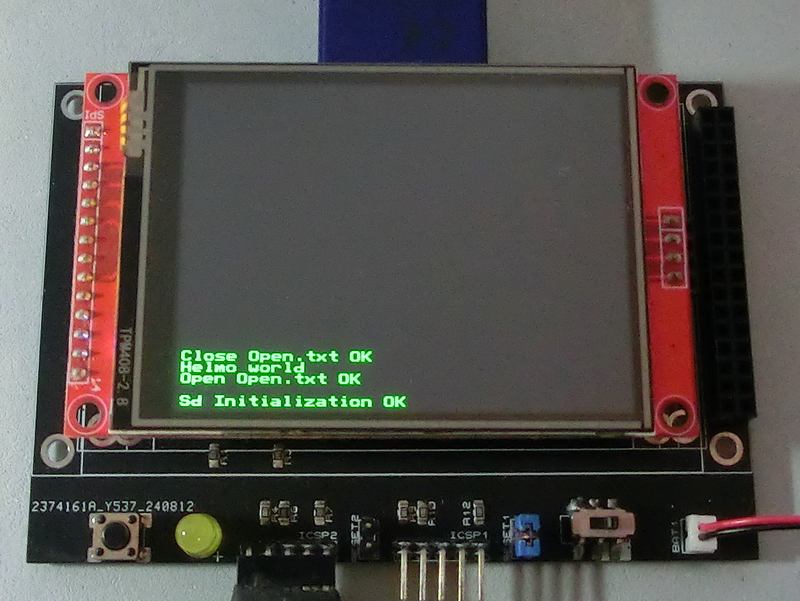 TftSetUp(0) 'Set screen TftResetScreen(BLACK) 'Reset screen TftSetSndFont(0,0) 'Set Font0 While File_Init() <> cErrOK : Wend 'Initialize SD Card TftPrintSndString("Sd Initialization OK",1,0,0,1,GREEN,BLACK,0) 'Confirm Initialize SD Card While File_Open("Open.txt") <> cErrOK : Wend 'Open file Open.txt to edit data TftPrintSndString("Open Open.txt OK",1,0,2,1,GREEN,BLACK,0) 'Confirm Open.txt is open bCounter = 0 'Print position counter Do TftPrintSndChar(File_ReadByte(),1,bCounter,3,1,GREEN,BLACK,0) 'Print data as text If File_EOF() = 1 Then Break 'Loop till end of file Inc bCounter Loop File_Close() 'close file TftPrintSndString("Close Open.txt OK",1,0,4,1,GREEN,BLACK,0) 'Confirm close file |