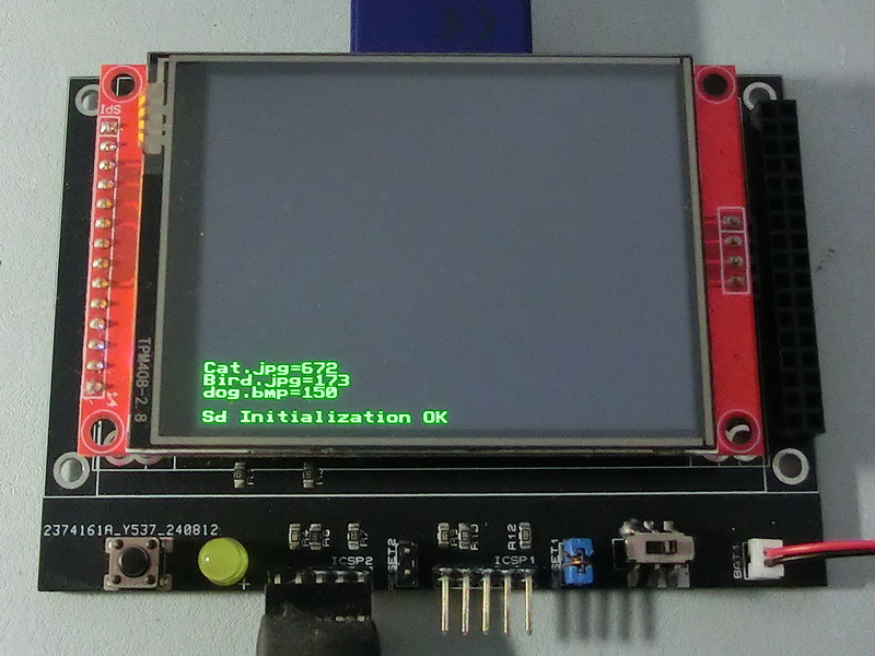 TftSetUp(0) 'Set screen TftResetScreen(BLACK) 'Reset screen TftSetSndFont(0,0) 'Set Font0 While File_Init() <> cErrOK : Wend 'Initialize SD Card TftPrintSndString("Sd Initialization OK",1,0,0,1,GREEN,BLACK,0) 'Confirm Initialize SD Card While File_Open("dog.bmp") <> cErrOK : Wend 'Open dog.bmp dTemp = File_SizeOpen() 'Get dog.bmp size File_Close() 'close file dTemp = dTemp / 1024 'Convert to KB TftPrintSndString("dog.bmp=" + Str$(Dec dTemp),1,0,2,1,GREEN,BLACK,0) 'Display file size While File_Open("Bird.jpg") <> cErrOK : Wend 'Open Bird.jpg dTemp = File_SizeOpen() 'Get Bird.jpg size File_Close() 'close file dTemp = dTemp / 1024 'Convert to KB TftPrintSndString("Bird.jpg=" + Str$(Dec dTemp),1,0,3,1,GREEN,BLACK,0) 'Display file size While File_Open("Cat.jpg") <> cErrOK : Wend 'Open Cat.jpg dTemp = File_SizeOpen() 'Get Cat.jpg size File_Close() 'close file dTemp = dTemp / 1024 'Convert to KB TftPrintSndString("Cat.jpg=" + Str$(Dec dTemp),1,0,4,1,GREEN,BLACK,0) 'Display file size |