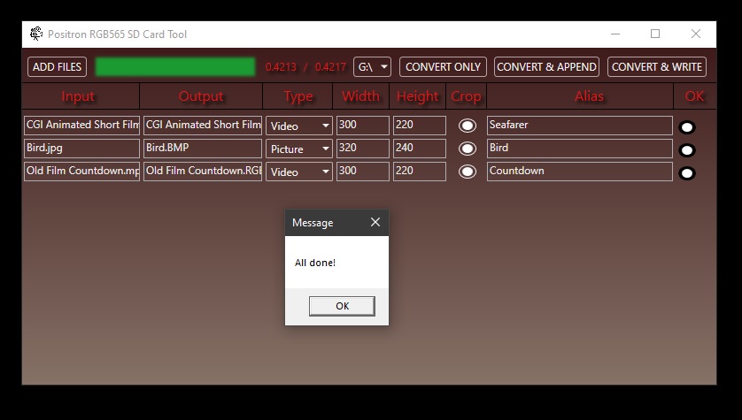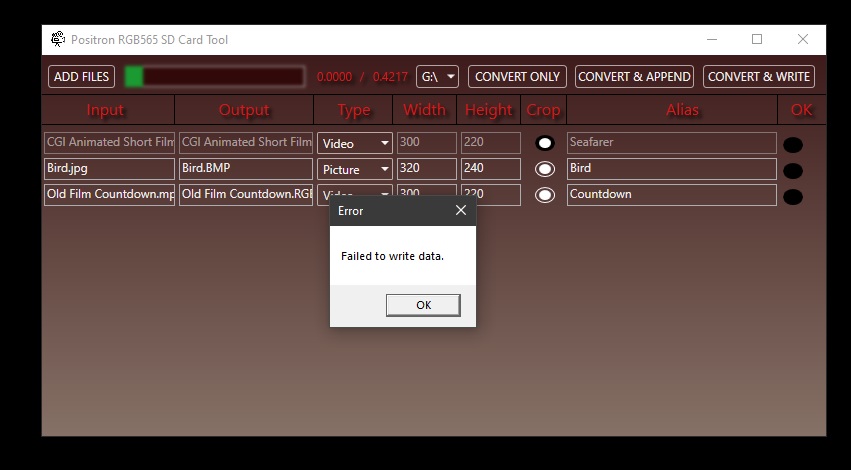 SdCardWriteRGB565.exe may sometimes fail to write to the SD card when using "CONVERT & WRITE" for large video files, also when NTFS, exFat, or FAT is used. This is because of the system is locking the MBR sector (sector 0) in this card.