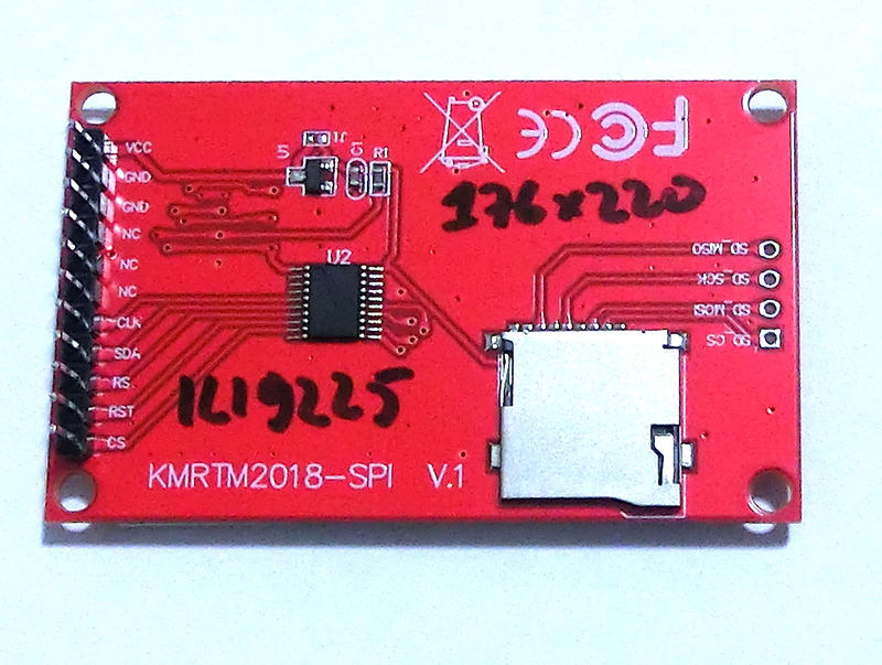 • 220x176 pixels • 2.00 inch • 16b RGB565 support • SDA single uni-directional line • TFT screen write only • Can use 5v or 3.3v supply selected with a solderable jumper resistor (0 Ohm) • SD Card slot available |