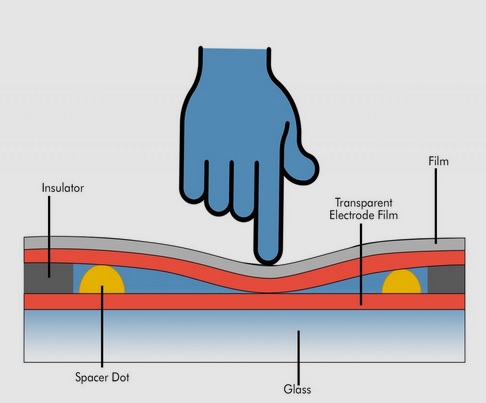 Resistive touch is a pressure-sensitive screen technology using two flexible, conductive layers separated by spacers; when pressed, the layers touch, changing electrical resistance to register a touch point, allowing input from fingers, gloves, or styluses, making it durable and cost-effective for industrial/medical use but less clear and gesture-friendly than capacitive screens.