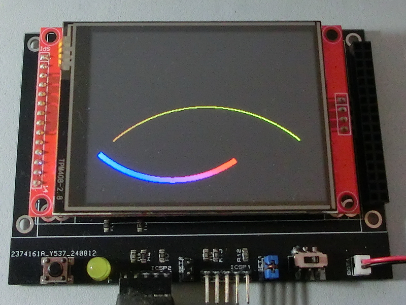 TftSetUp(0) TftResetScreen(BLACK) TftArcG(30,80,290,80,200,0,YELLOW, BROWN,1,0) TftArcG(10,60,200,50,160,1,BLUE,RED,6,-1) |