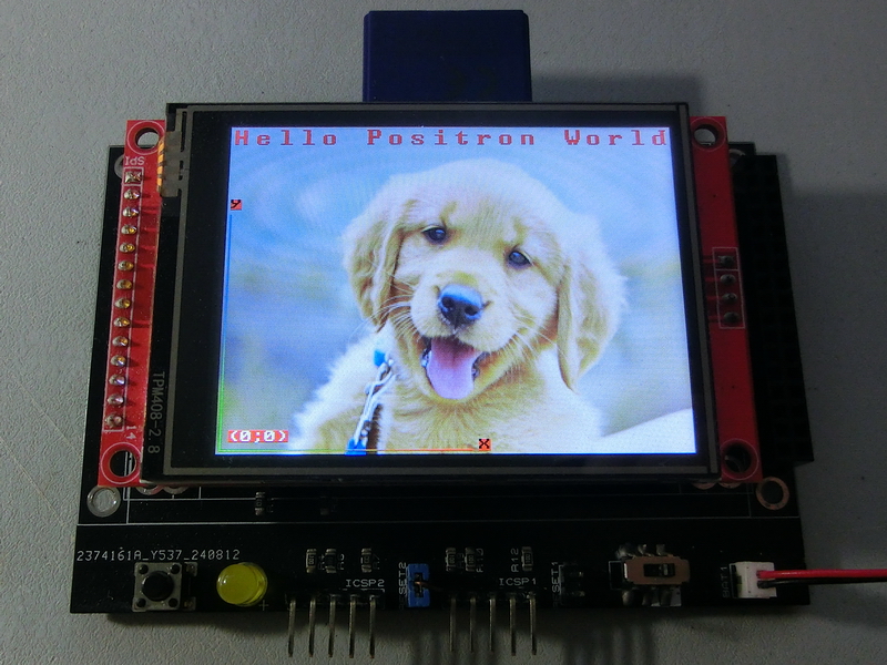 Clear SetCrystal() SetPins() TftBmpMemSet() TftSetUp(0) TftBmpFromSD("dog.bmp",0,0) TftSetSndFont(4,0) TftPrintSndString("Hello Positron World",1,0,14,1,RED,WHITE,1) TftSetSndFont(0,0) TftPrintSndString("(0;0)",1,1,1,1,WHITE,RED,0) TftLineHNG(2,170,2,GREEN,RED) TftPrintSndChar("X",1,175,2,0,BLACK,RED,0) TftLineVNG(2,2,170,GREEN,BLUE) TftPrintSndChar("Y",1,2,175,0,BLACK,RED,0) SPI1STAT = 0x0000 : SPI2STAT = 0x0000 '|Lower SPI baud rate SPI1CON1 = 0x0323 : SPI2CON1 = 0x0323 '|for TFT screen read SPI1BUF = 0 : SPI2BUF = 0 '|Clear buffer SPI1STAT = 0x8000 : SPI2STAT = 0x8000 '|and SD Card write TftBmpScreenshotSd("Screen1.BMP", 0,0, 320,240) SPI1STAT = 0x0000 : SPI2STAT = 0x0000 '|Restore SPI baud rate SPI1CON1 = 0x033B : SPI2CON1 = 0x033B '|to default values i.e. SPI1BUF = 0 : SPI2BUF = 0 '|Clear buffer SPI1STAT = 0x8000 : SPI2STAT = 0x8000 '|maximum read speed |