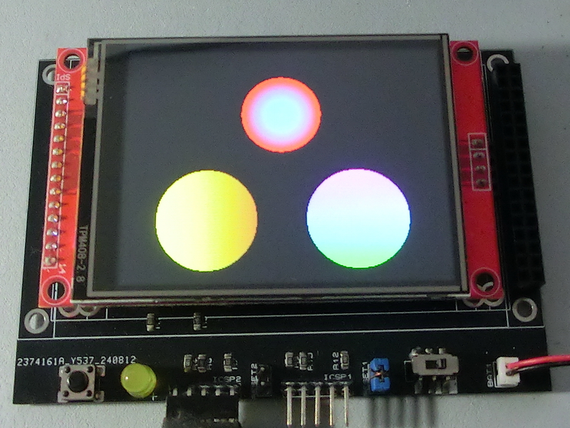 TftSetUp(0) TftResetScreen(BLACK) TftCircleG(80,60,50,YELLOW,BROWN,0) TftCircleG(230,60,50,GREEN,PINK,1) TftCircleG(155,170,40,CYAN,RED,2) |