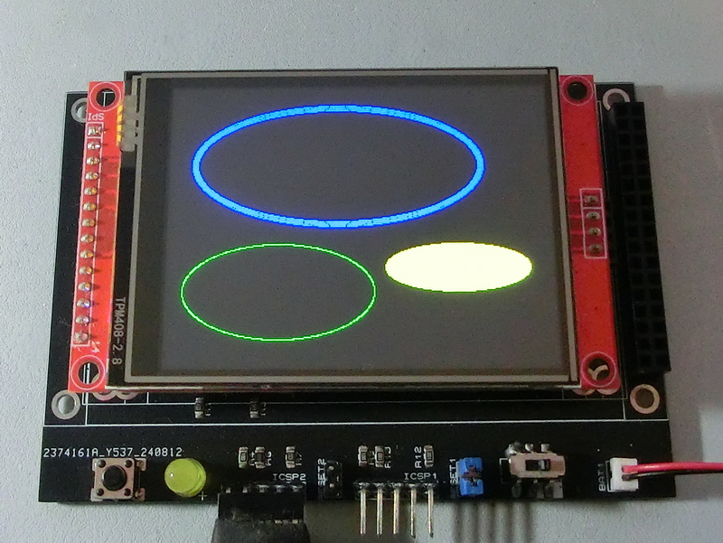 TftSetUp(0) TftResetScreen(BLACK) TftEllipseE(90,60,80,40,GREEN) TftEllipseS(240,80,60,20,YELLOW) TftEllipse(140,170,120,50,0,BLUE,4,1) |