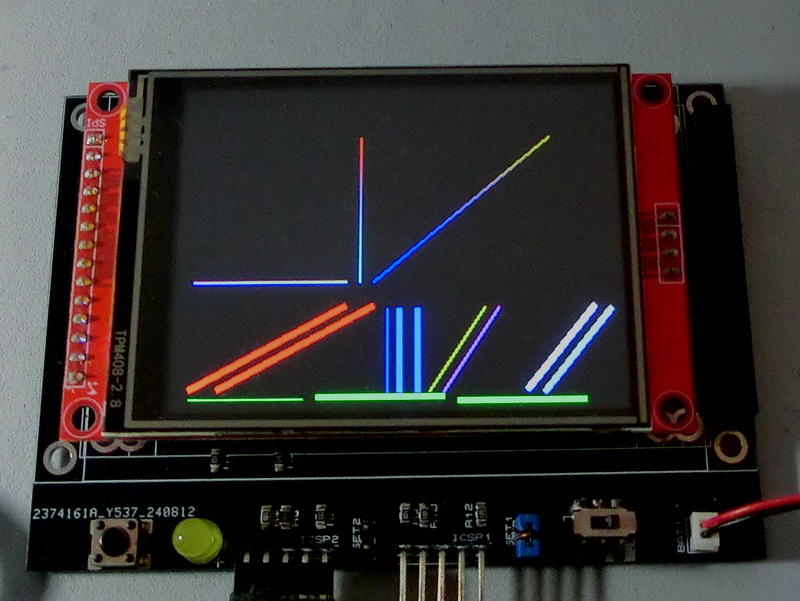 TftSetUp(0) TftResetScreen(BLACK) TftLineHN(10,90,5,GREEN) TftLineHTU(100,190,5,GREEN,3) TftLineHTD(200,290,5,GREEN,3) TftLine(10,10,120,70,RED,3,-1) TftLine(30,10,140,70,RED,3,-1) TftLineVN(150,10,70,BLUE) TftLineVTL(160,10,70,BLUE,3) TftLineVTR(170,10,70,BLUE,3) TftLineDN(180,10,220,70,YELLOW) TftLineDNF(190,10,230,70,PINK) TftLineDT(250,10,300,70,LIGHTGREY,3,-1) TftLineDT(260,10,310,70,DARKGREY,3,1) TftLineHNG(10,120,90,VIOLET,WHITE) TftLineVNG(130,90,200,CYAN,RED) TftLineDNG(140,90,270,200,BLUE,ORANGE) |
