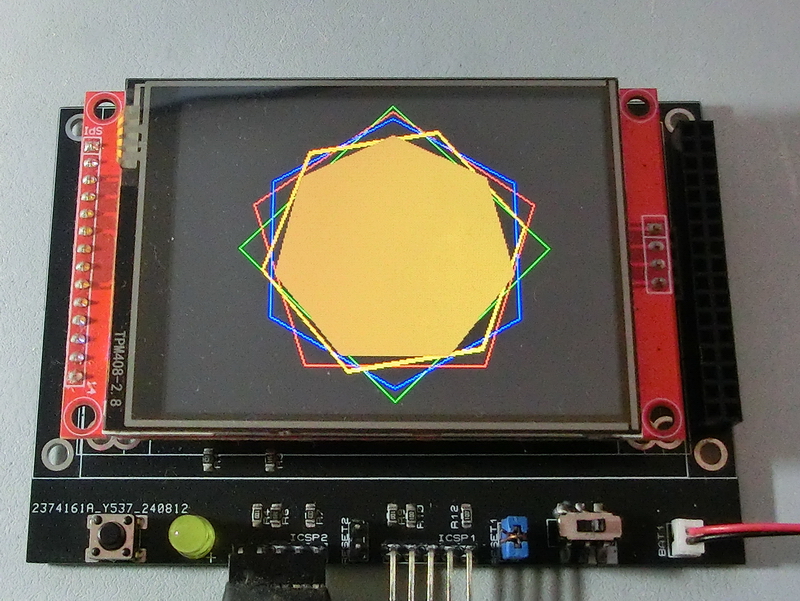TftSetUp(0) TftResetScreen(BLACK) TftPolygon(160,120,115,4,0,0,GREEN,0,0) TftPolygon(160,120,110,5,0,0,RED,0,0) TftPolygon(160,120,105,6,0,0,BLUE,0,0) TftPolygon(160,120,100,6,20,0,ORANGE,2,-1) TftPolygon(160,120,90,7,0,1,BROWN,0,0) |