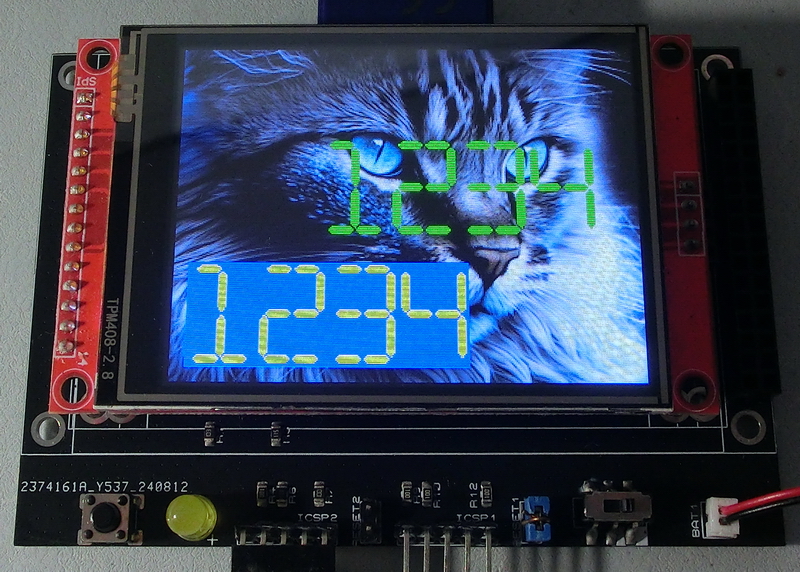 $define FontSmooth 0 $define FontMaxSpace 16 $define FontMaxPixels 16 Include "TftLib\Fonts\SND\F51_SND_48x72_Digits_Sixteen_Segment.inc" Include "TftLib\TFT_Graphic_Lib.inc" '... TftSetUp(0) TftSetSndFont(51,0) TftBmpFromSD("Cat.BMP", 0,0) TftPrintSndInteger(1234, 0, 0, 10, 10, 0, YELLOW, BLUE, 0) TftPrintSndInteger(1234, 0, 0, 100, 100, 0, GREEN, BLUE, 1) |