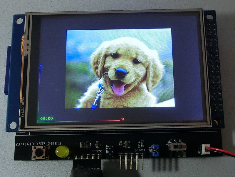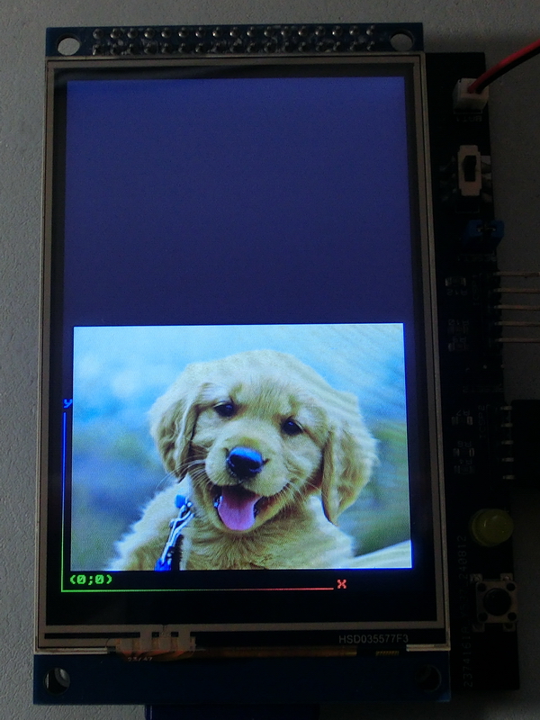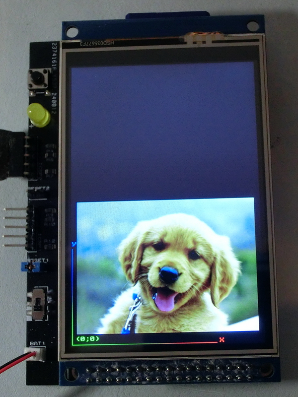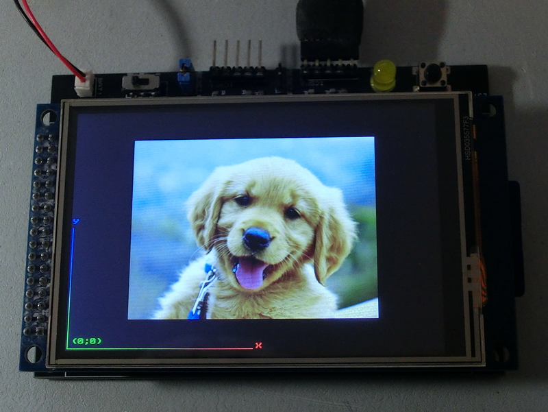 TftSetUp(0) TftResetScreen(BLACK) TftPrintSndString("(0;0)",1,1,1,1,GREEN,BLACK,0) TftLineHNG(2,240,2,GREEN,RED) TftPrintSndChar("X",1,245,2,0,RED,BLACK,0) TftLineVNG(2,2,160,GREEN,BLUE) TftPrintSndChar("Y",1,2,165,0,BLUE,BLACK,0) 'TftBmpFromSD("dog.bmp",10,20) TftBmpFromSD("dog.bmp",80,40) |